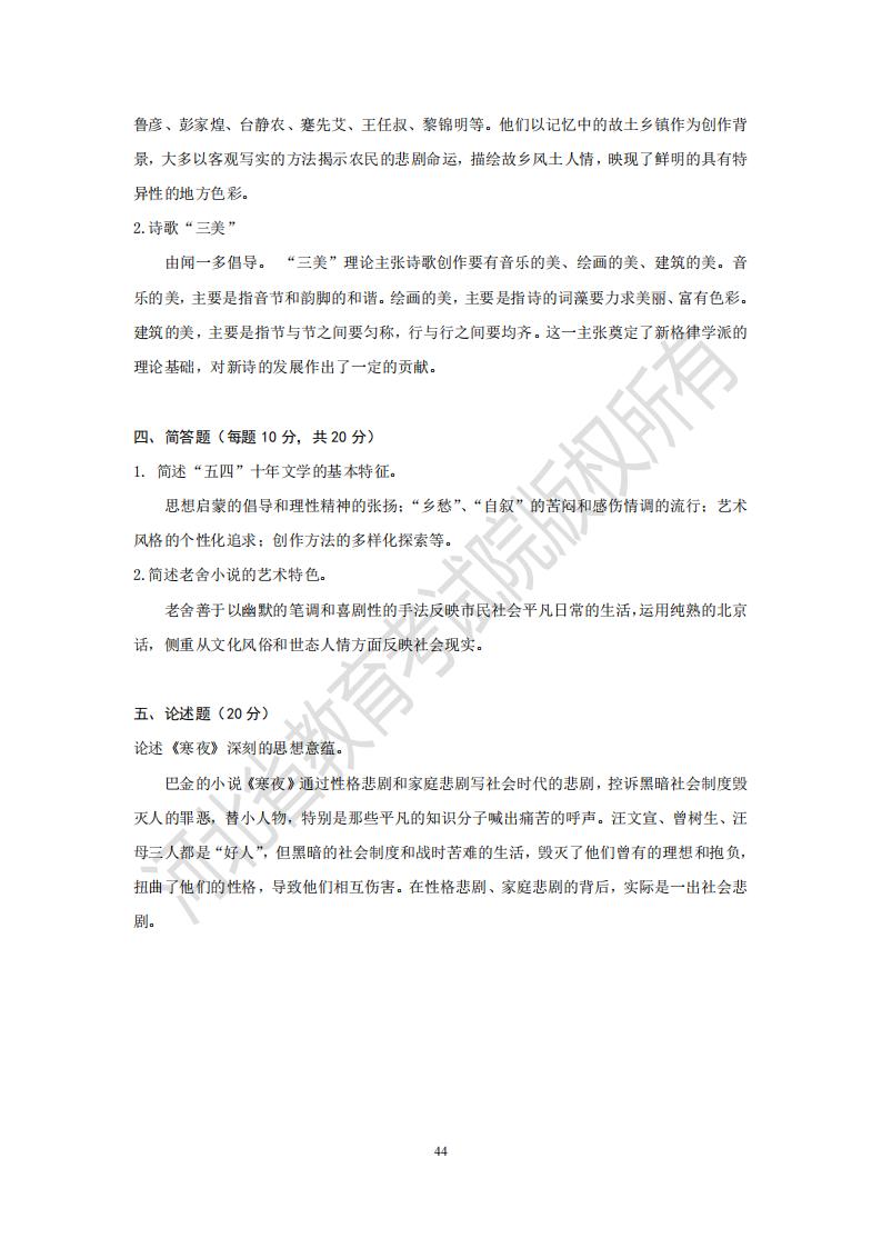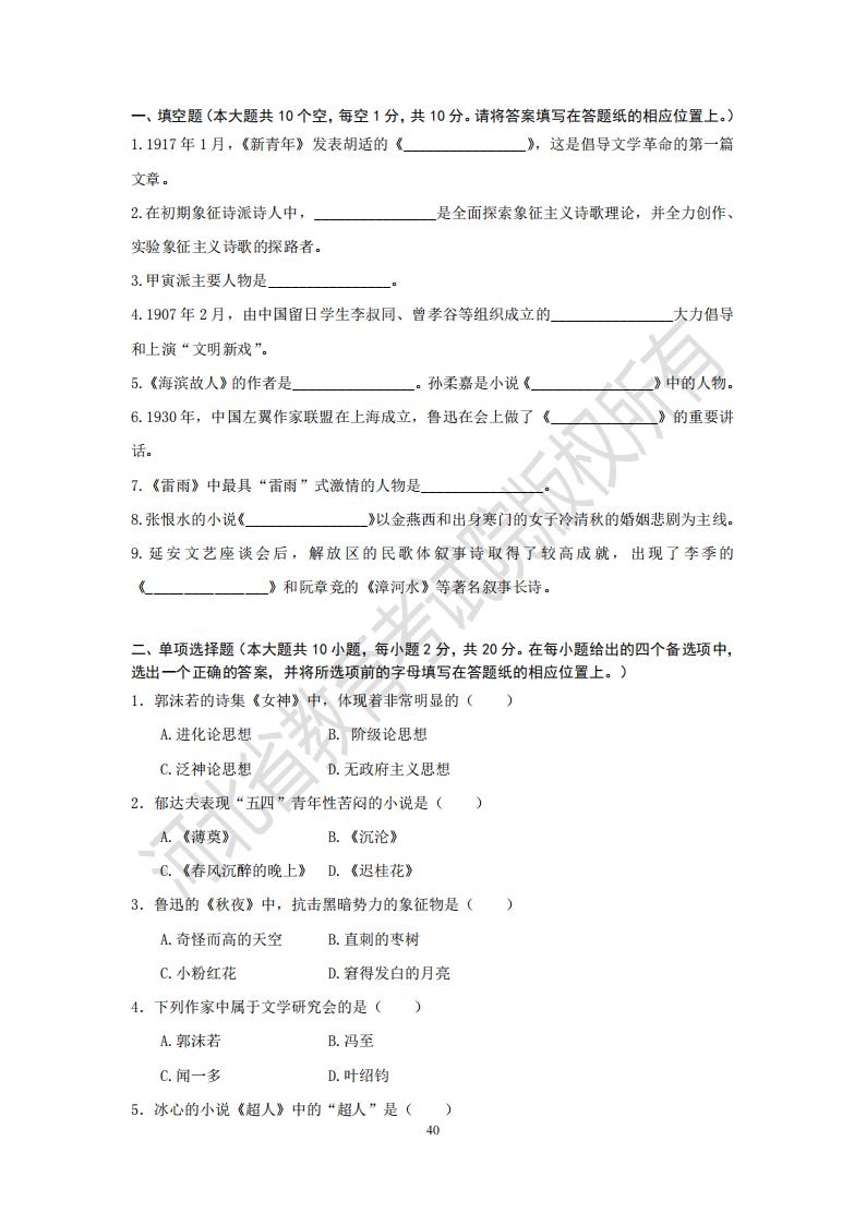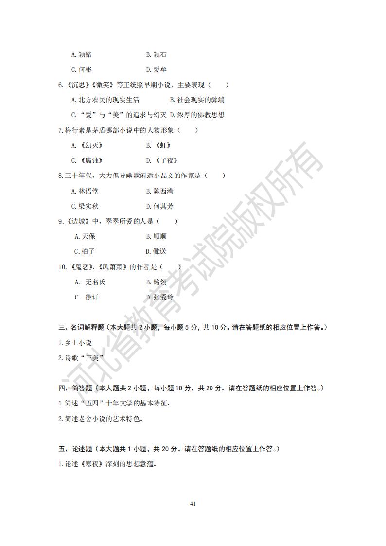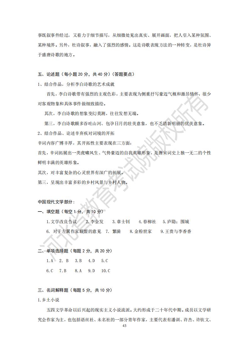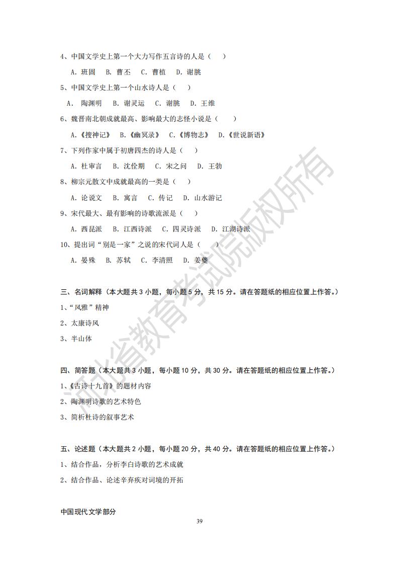 河北省普通高等學校專升本考試中國古代文學、中國現代文學模擬試卷及參考答案