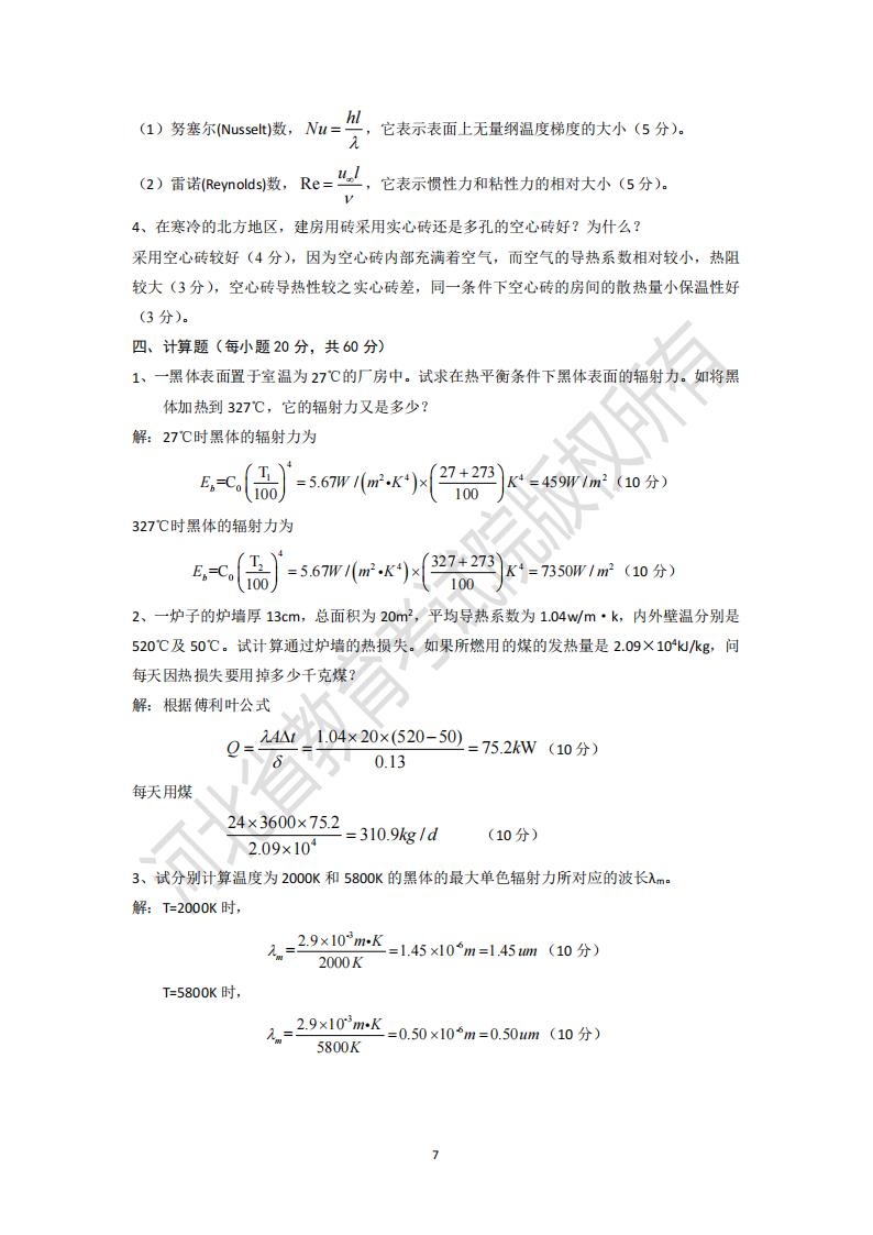 2、一爐子的爐墻厚 13cm,總面積為 20m2,平均導熱系數為 1.04w/m·k,內外壁溫分別是520℃及 50℃。試計算通過爐墻的熱損失。如果所燃用的煤的發熱量是 2.09×104kJ/kg,問每天因熱損失要用掉多少千克煤?