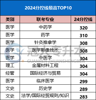 河北省2024年全日制統招專升本考試分控線最高10個專業匯總,有醫學類中藥學分控線320分,醫學類藥學專業分控線310分,醫學類針灸推拿學專業分控線為308分,醫學類醫學影像技術專業分控線為308分,醫學類中醫學專業分控線為304分,理工類金屬材料工程專業分控線為304分,經管類國際經濟與貿易專業分控線為304分,醫學類臨床醫學專業分控線為299分,文史類歷史學專業分控線為289分,文史類法學/國際經貿規則/知識產權專業分控線為283分。