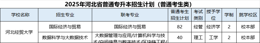 2025年河北省普通專升本河北經(jīng)貿(mào)大學專升本招生計劃已公布,參加2025年河北專升本考試的考生請查看下表2025年河北經(jīng)貿(mào)大學專升本招生計劃信息。