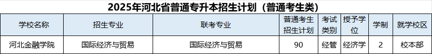 2025年河北省普通專升本河北金融學院專升本招生計劃已公布,參加2025年河北專升本考試的考生請查看下表2025年河北金融學院專升本招生計劃信息。