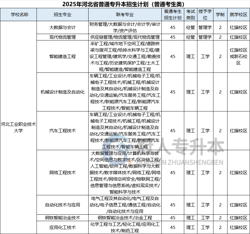 2025年河北省普通專升本河北工業(yè)職業(yè)技術大學專升本招生計劃已公布,參加2025年河北專升本考試的考生請查看下表2025年河北工業(yè)職業(yè)技術大學專升本招生計劃信息。