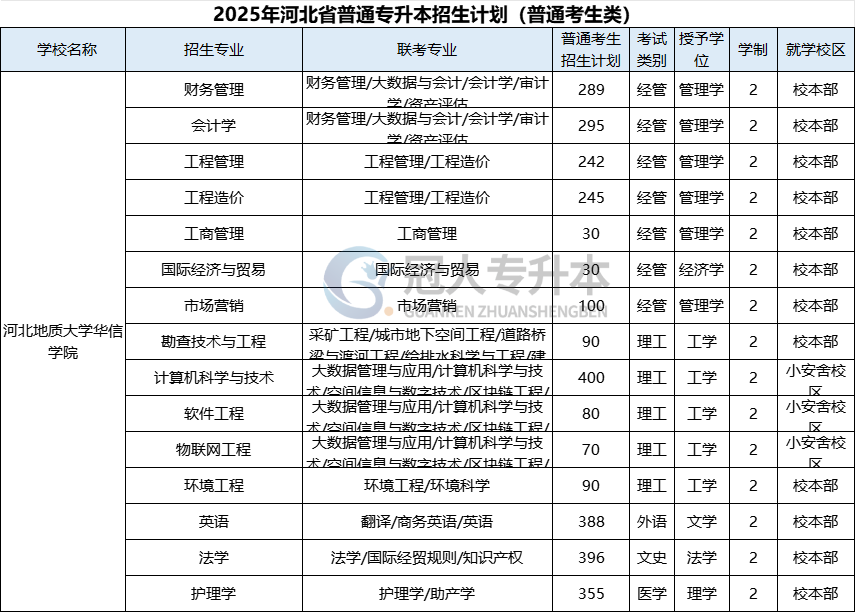 2025年河北省普通專升本河北地質大學華信學院專升本招生計劃已公布,參加2025年河北專升本考試的考生請查看下表2025年河北地質大學華信學院專升本招生計劃信息。