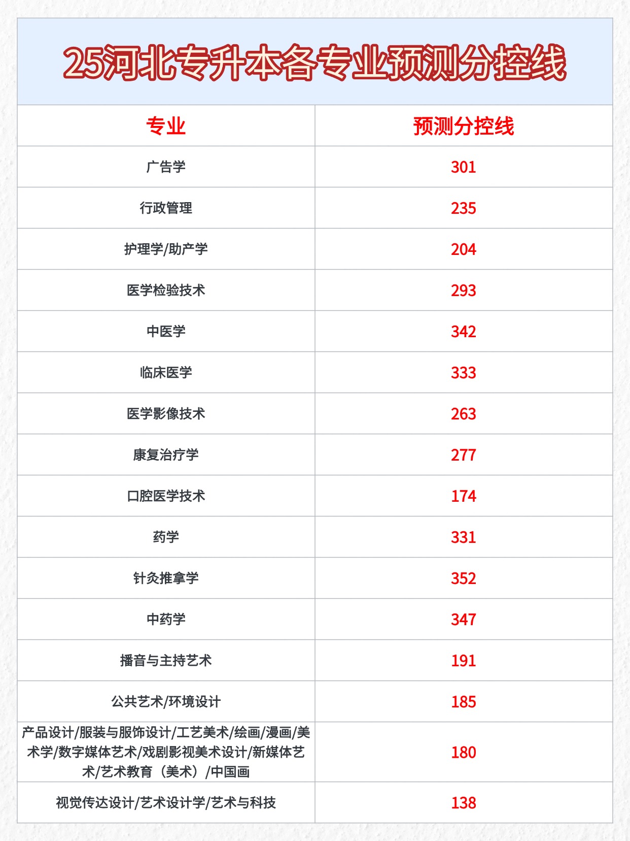 25年河北專升本的考生看過來了,結(jié)合25年的招生計(jì)劃,幫大家整理了各專業(yè)的預(yù)測分控線,大家可以參考一下!