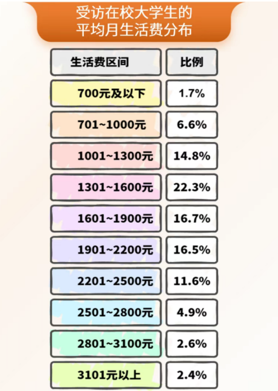 2025年研究顯示,大學生平均每月生活費為1744元。同時,生活費在1301-1600元區間的占比最高。你在哪一個層級?快來分享一下吧~