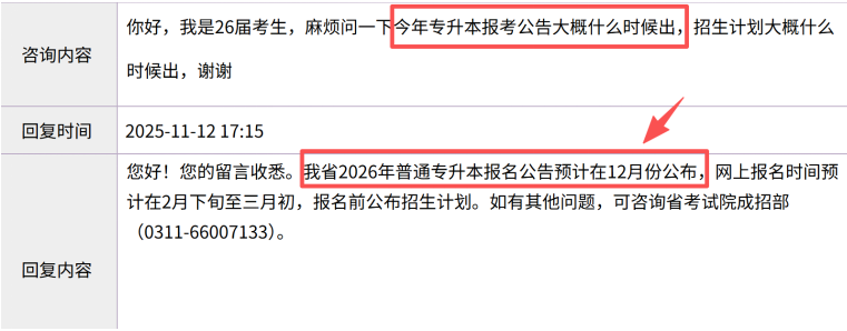 河北教育考試院明確發布:26年普通專升本報考公告預計在12月份公布,網上報名時間預計在2月下旬至3月初,報名前公布招生計劃。
