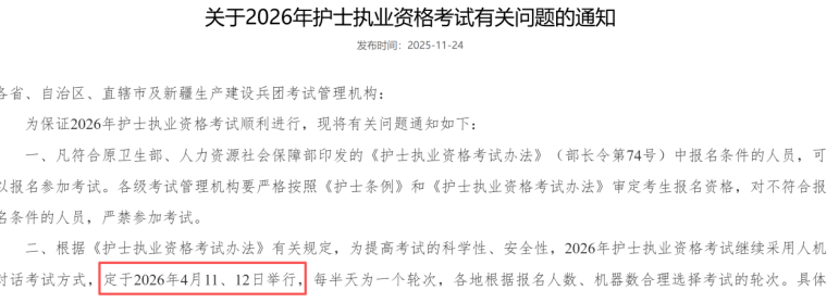 整體穩定在4月下旬,不會有太大的變化。此外,11月24日,國家衛生健康委人才交流服務中心發布了2026年護士執業資格考試時間,將在2026年4月11日至12日舉行。