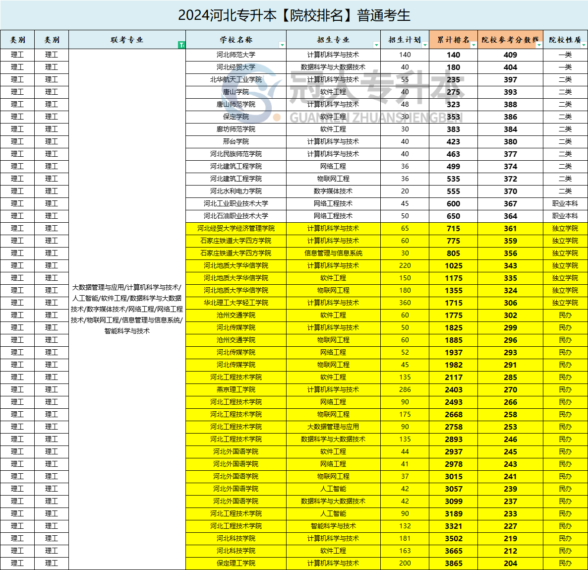 每年本科院校都會向河北教育廳提交當年的招生計劃。每年招生的專業和招生人數會略有不同,下表是24年河北專升本計算機專業的招生院校,可以作為參考。具體的招生院校要以河北教育考試院發布的
