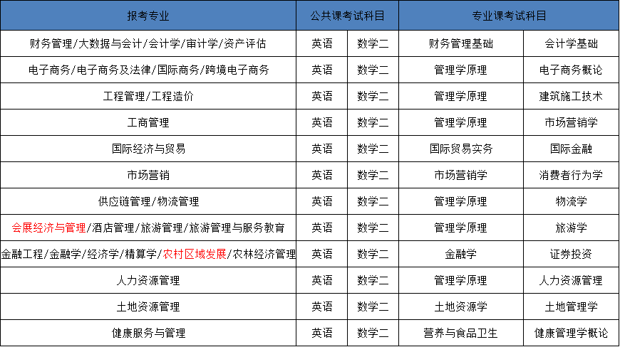 財務管理/大數據與會計/會計學/審計學/資產評估【會計聯考】,電子商務/電子商務及法律/國際商務/跨境電子商務【電子商務聯考】,工程管理/工程造價【工程管理聯考】,工商管理,國際經濟與貿易,市場營銷,供應鏈管理/物流管理【物流管理聯考】,會展經濟與管理/酒店管理/旅游管理/旅游管理與服務教育【旅游管理聯考】,金融工程/金融學/經濟學/精算學/農村區域發展/農林經濟管理【金融聯考】,人力資源管理,土地資源管理,健康服務與管理