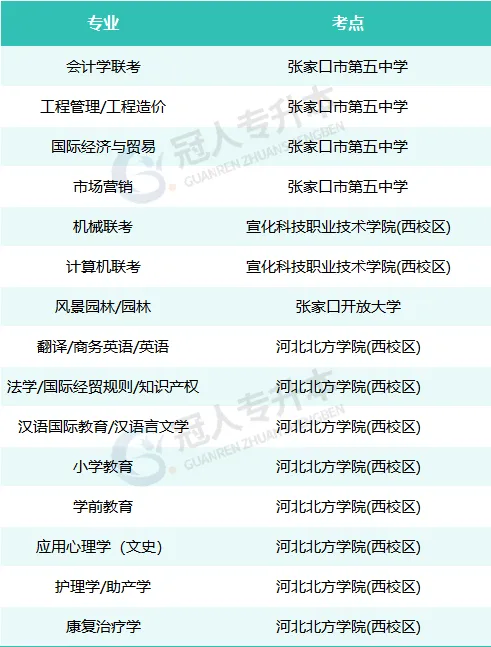 2025年河北張家口市專升本考試地點匯總:張家口市第五中學,宣化科技職業技術學院西校區,張家口開放大學,河北北方學院西校區。參加2025年河北專升本考試的考生可以就近選擇專升本考試